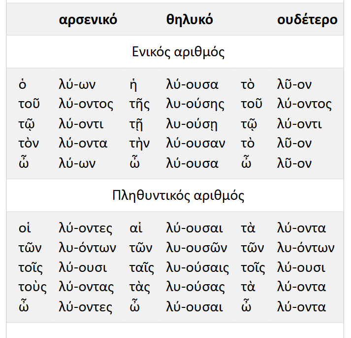ejemplo: λύ-ων, λύ-ουσα, λύ-ον