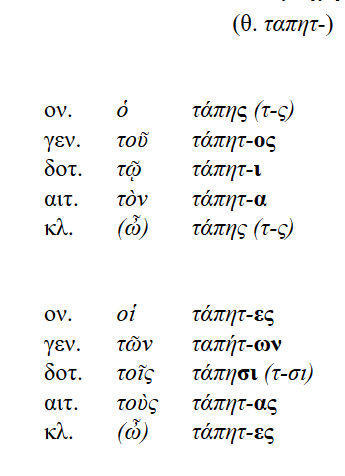Sustantivos masculinos y femeninos con raíz dental y carácter temático dental en "τ". (τάπητ-)